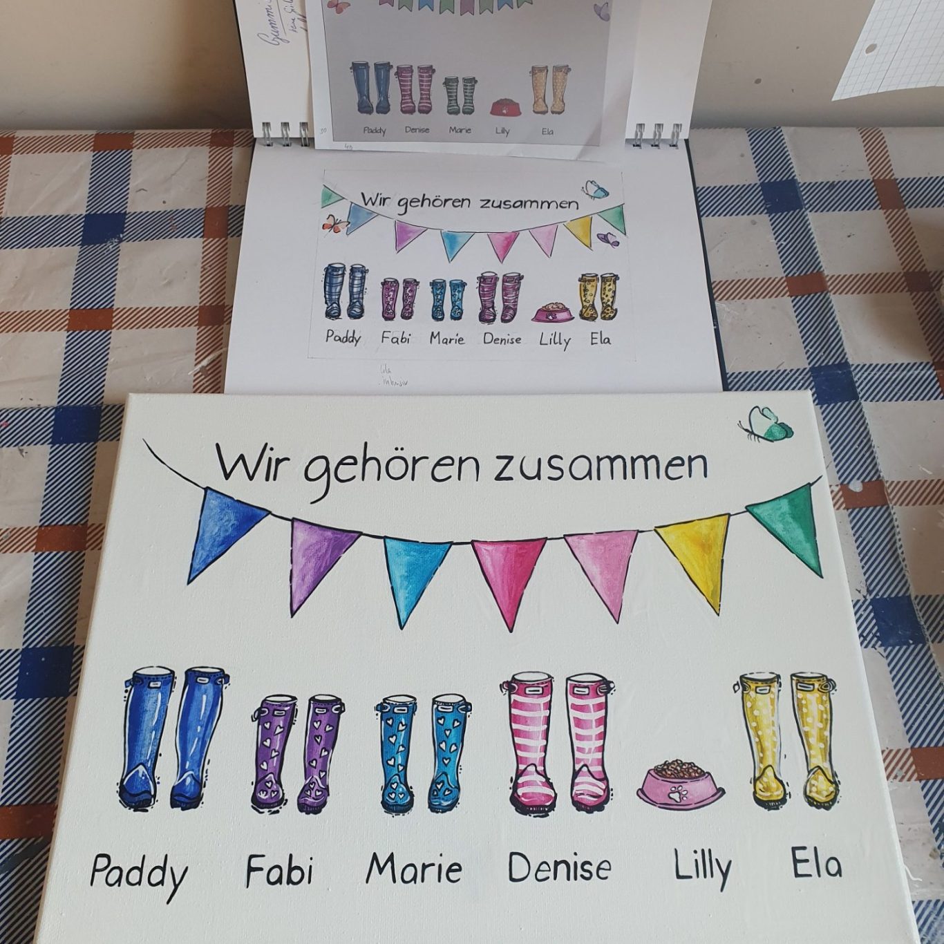 Von der Vorlage, über die Skizze mit den Änderungswünschen zur fertigen Umsetzung auf Leinwand.